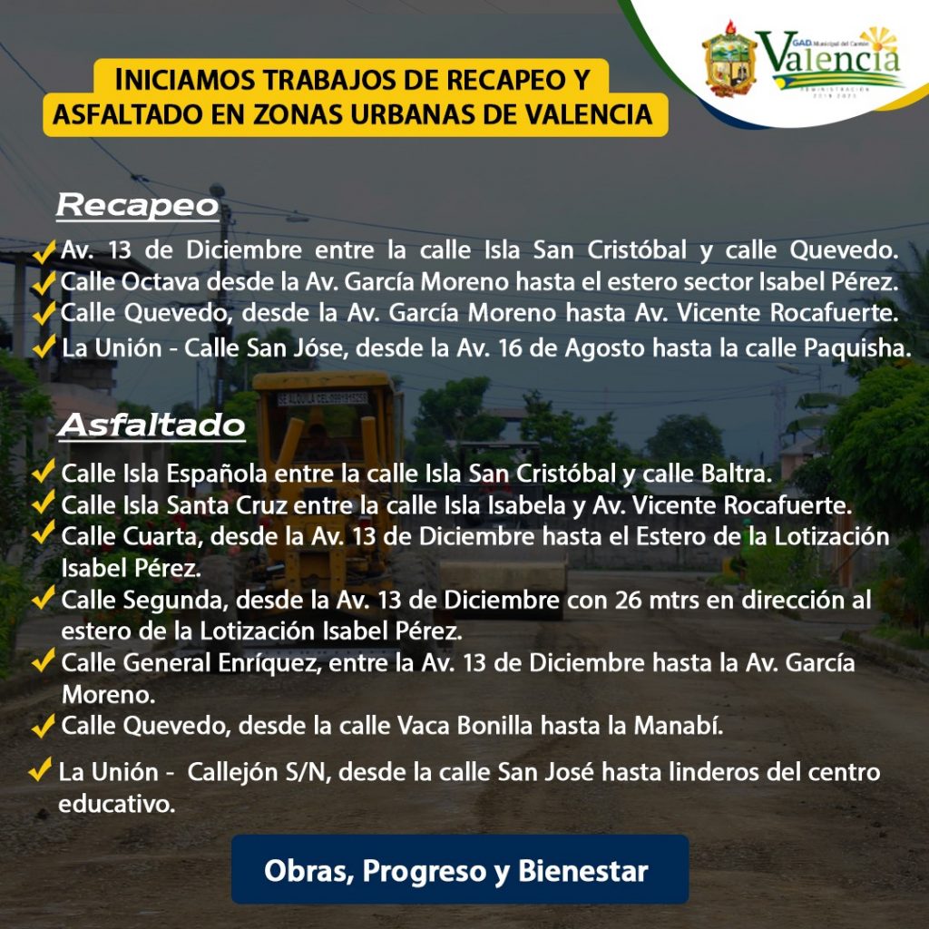 El asfaltado y recapeo llegara a varias calles de la Coop. 12 de Julio, Lotización Isabel Pérez, centro de Valencia, Lotización Abel Jiménez, El Paraíso, Ciudadela del Sindicato de Chóferes, así como en La parroquia La Unión.