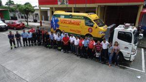 Dos camiones de bomberos recibieron con el tradicional arco de agua a la nueva ambulancia que fue adquirida por la EP Cuerpo de Bomberos de…