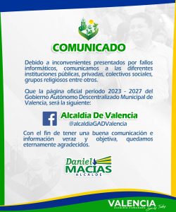 Informamos a nuestros seguidores, que la Alcaldía Ciudadana de Valencia, maneja nueva Pagina Oficial de Facebook, denominada: Alcaldía de Valencia Link: https://www.facebook.com/alcaldiaGADValencia